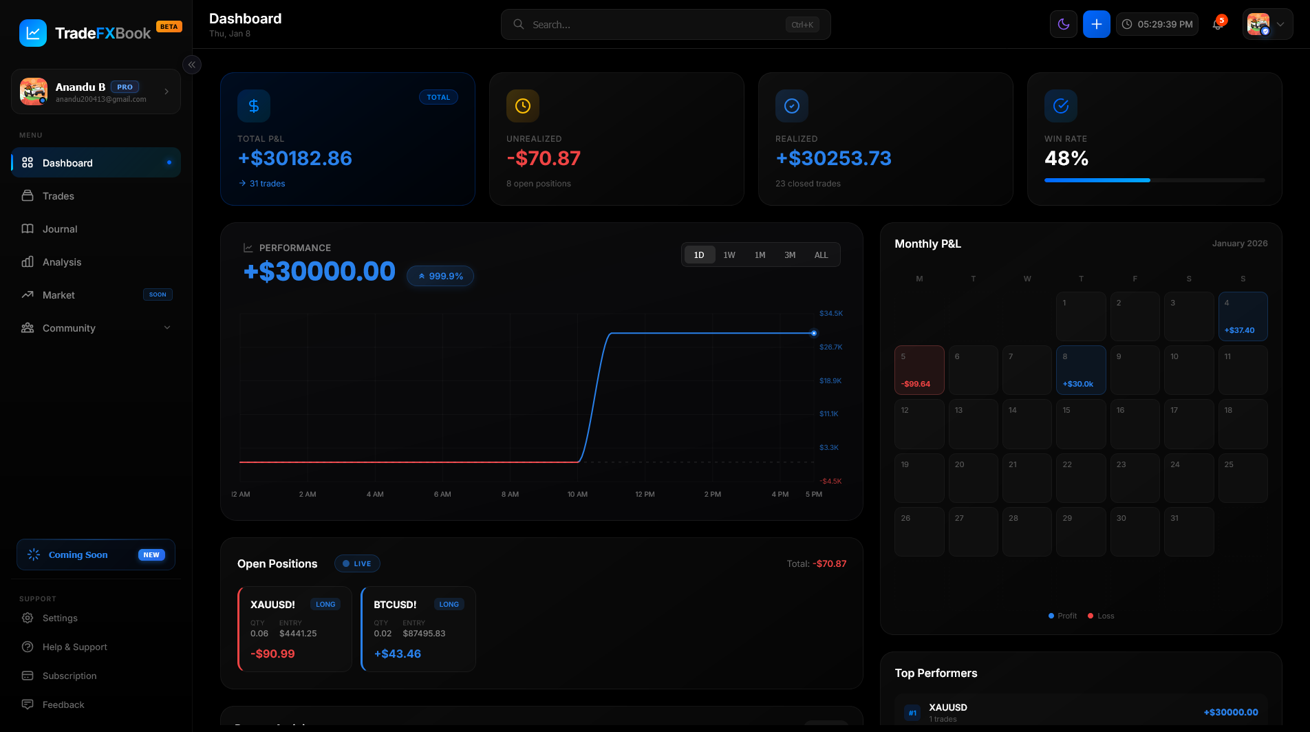 Comprehensive dashboard with equity curves, daily PnL, win rate, and profit factor. Visualize your performance with calendar heatmaps and distribution charts.